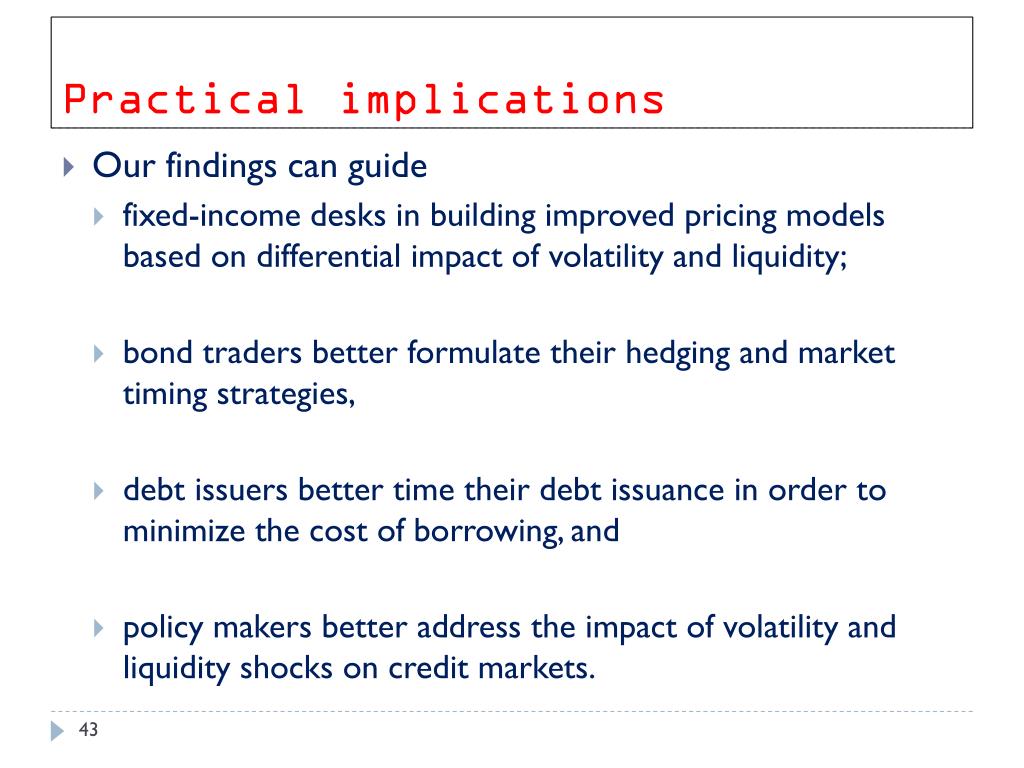 Practical implications • Our findings can guide • fixed-income desks in building improved pricing models based on differential impact of volatility and liquidity; • bond traders better formulate their hedging and market timing strategies, • debt issuers better time their debt issuance in order to minimize the cost of borrowing, and • policy makers better address the impact of volatility and liquidity shocks on credit markets.