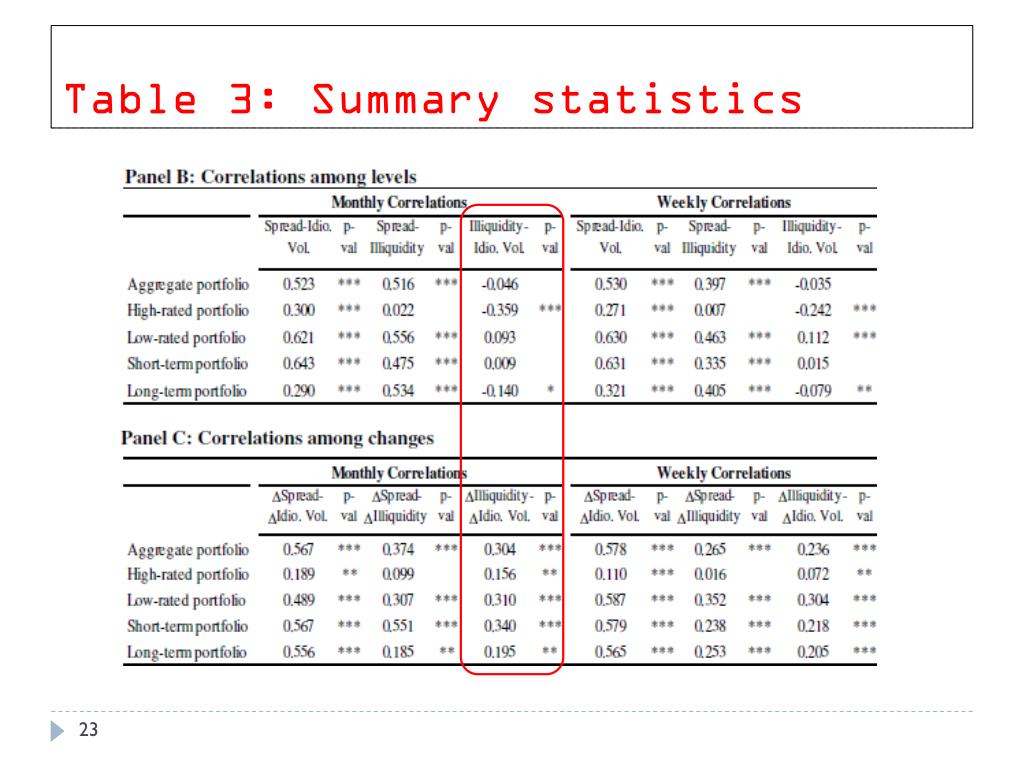 Summary of Results: (1) • First, both idiosyncratic volatility and liquidity effects jointly and significantly matter only for • the distress portfolios i.e. low rated and short-term bonds; • for other portfolios volatility subsumes liquidity. • The effect of 1σ shock of volatility (bond illiquidity) on aggregate bond spreads is 16 bps, (6 bps), and increases to 23 bps (9 bps) for low-rated bonds.
