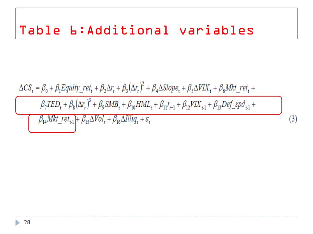 Collin-Dufresne et al.(2001)puzzle • Does idiosyncratic volatility and illiquidity explain the systematic variation in bond spread residuals? • Principal component tests show: • that the idiosyncratic volatility and illiquidity variables mainly capture idiosyncratic or portfolio specific information, and • not the systematic variation that can address the Collin-Dufresne et al. (2001) puzzle