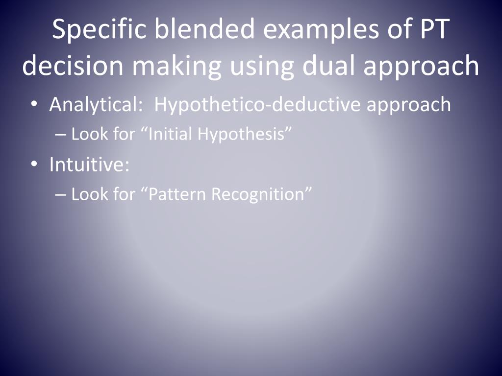 Specific blended examples of PT decision making using dual approach • Analytical: Hypothetico-deductive approach • Look for “Initial Hypothesis” • Intuitive: • Look for “Pattern Recognition”