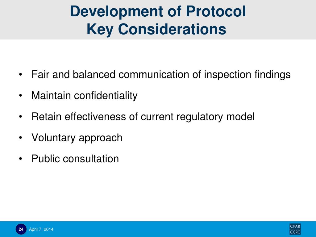 Effective Date • Protocol is effective for RI audit file inspections commencing on or after March 1, 2014 • Voluntary approach • Listing of audit firms participating in the Protocol to be made available on CPAB’s website