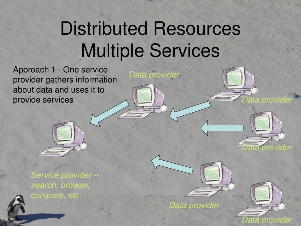 Distributed ResourcesMultiple Services Approach 1 - One service provider gathers information about data and uses it to provide services Data provider Data provider Data provider Service provider -- search, browse, compare, etc. Data provider Data provider