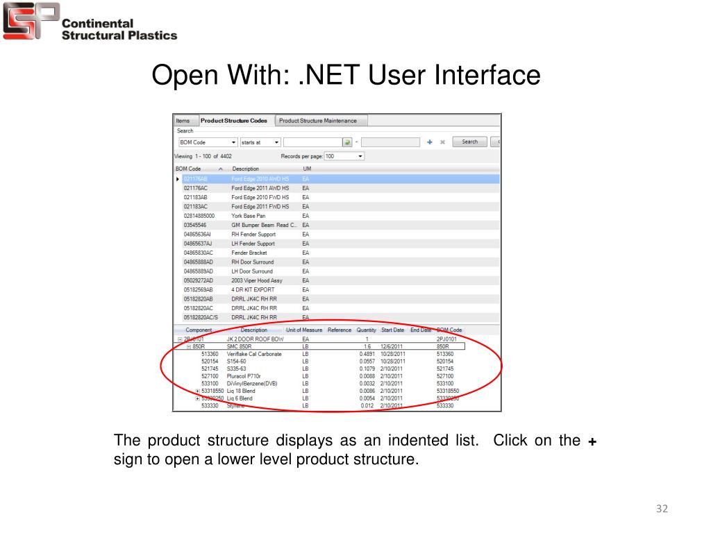 Open With: .NET User Interface The product structure displays as an indented list. Click on the + sign to open a lower level product structure.