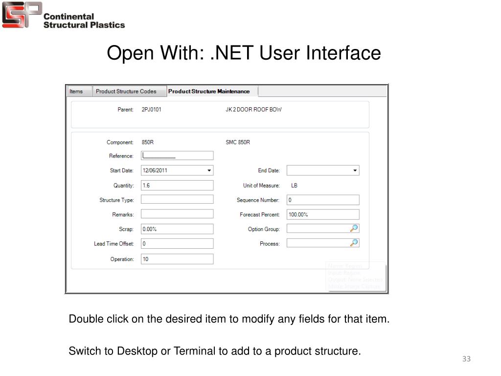 Open With: .NET User Interface Double click on the desired item to modify any fields for that item. Switch to Desktop or Terminal to add to a product structure.