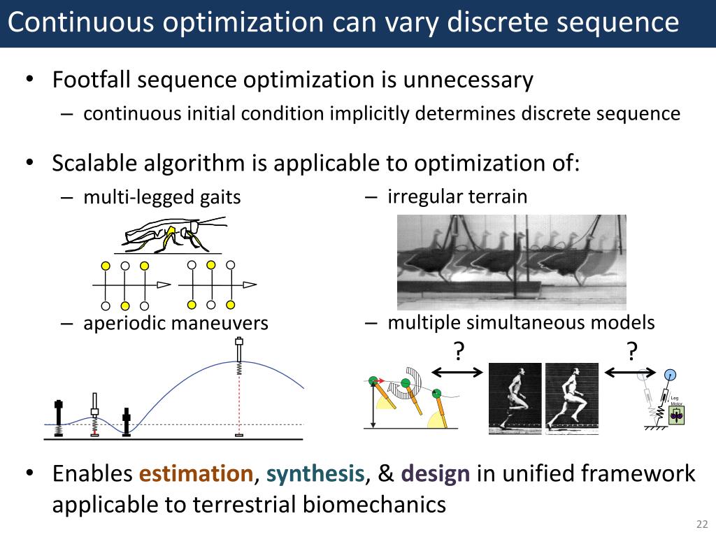 Continuous optimization can vary discrete sequence • Footfall sequence optimization is unnecessary • continuous initial condition implicitly determines discrete sequence • irregular terrain • multiple simultaneous models ? ? • Enables estimation, synthesis, & designin unified framework applicable to terrestrial biomechanics • Scalable algorithm is applicable to optimization of: • multi-legged gaits • aperiodic maneuvers