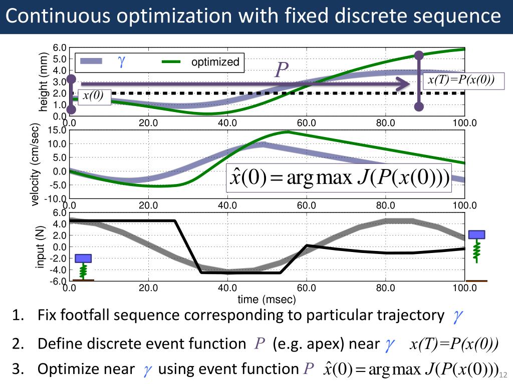 Continuous optimization with fixed discrete sequence P g x(T)=P(x(0)) x(0) x(T)=P(x(0)) • Fix footfall sequence corresponding to particular trajectory g • Define discrete event function P (e.g. apex) near g • Optimize near g using event function P