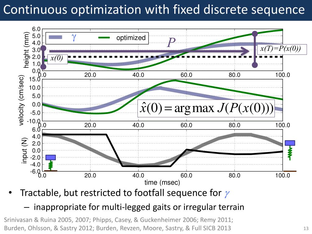 Continuous optimization with fixed discrete sequence P g x(T)=P(x(0)) x(0) • Tractable, but restricted to footfall sequence for g • inappropriate for multi-legged gaits or irregular terrain Srinivasan & Ruina 2005, 2007; Phipps, Casey, & Guckenheimer 2006; Remy 2011; Burden, Ohlsson, & Sastry 2012; Burden, Revzen, Moore, Sastry, & Full SICB 2013