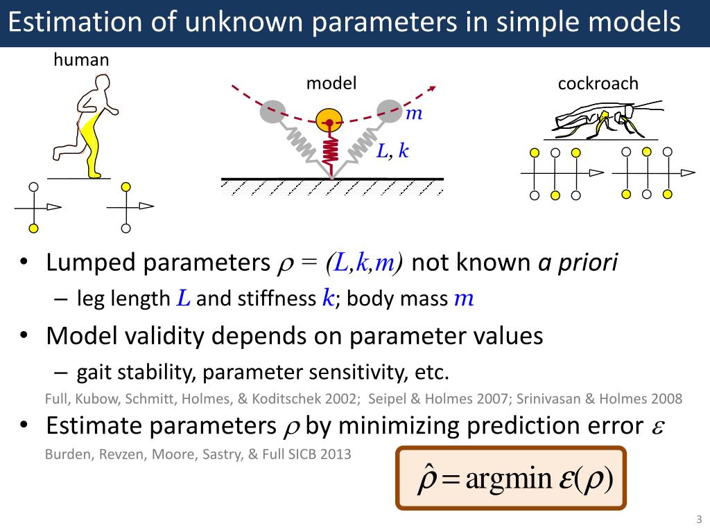 Estimation of unknown parameters in simple models model human m cockroach L, k Full, Kubow, Schmitt, Holmes, & Koditschek 2002; Seipel & Holmes 2007; Srinivasan & Holmes 2008 Burden, Revzen, Moore, Sastry, & Full SICB 2013 • Lumped parameters r = (L,k,m) not known a priori • leg length Land stiffnessk; body mass m • Model validity depends on parameter values • gait stability, parameter sensitivity, etc. • Estimate parameters r by minimizing prediction error e