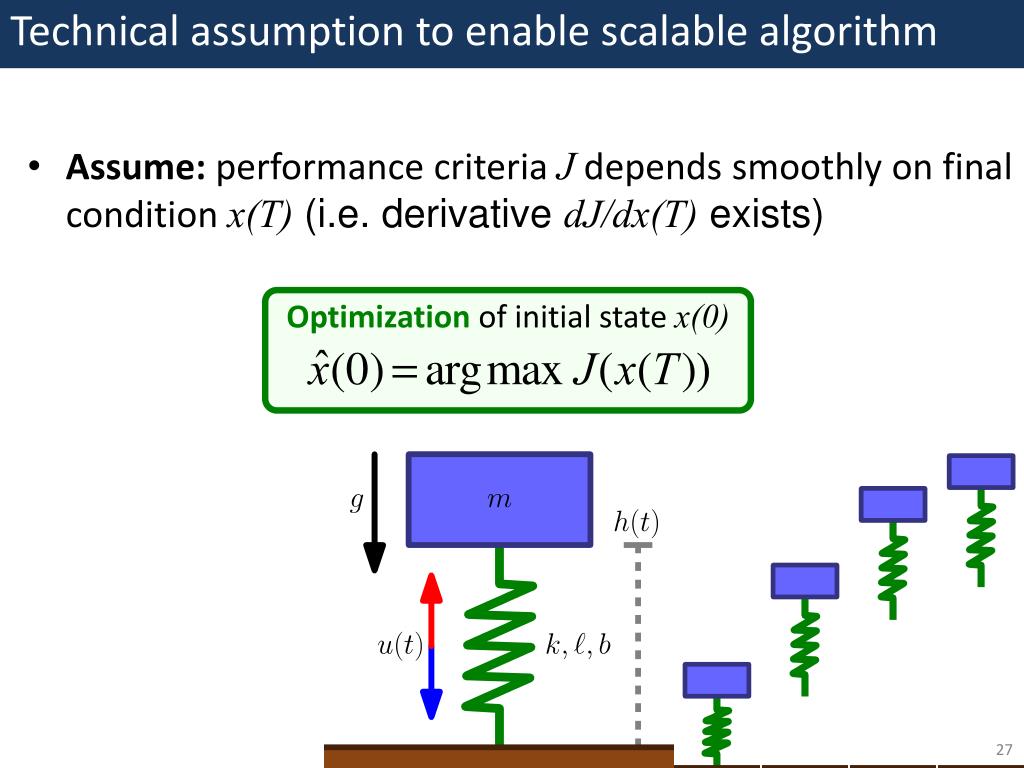 Technical assumption to enable scalable algorithm • Assume: performance criteria J depends smoothly on final condition x(T) (i.e. derivative dJ/dx(T) exists) Optimizationof initial state x(0)