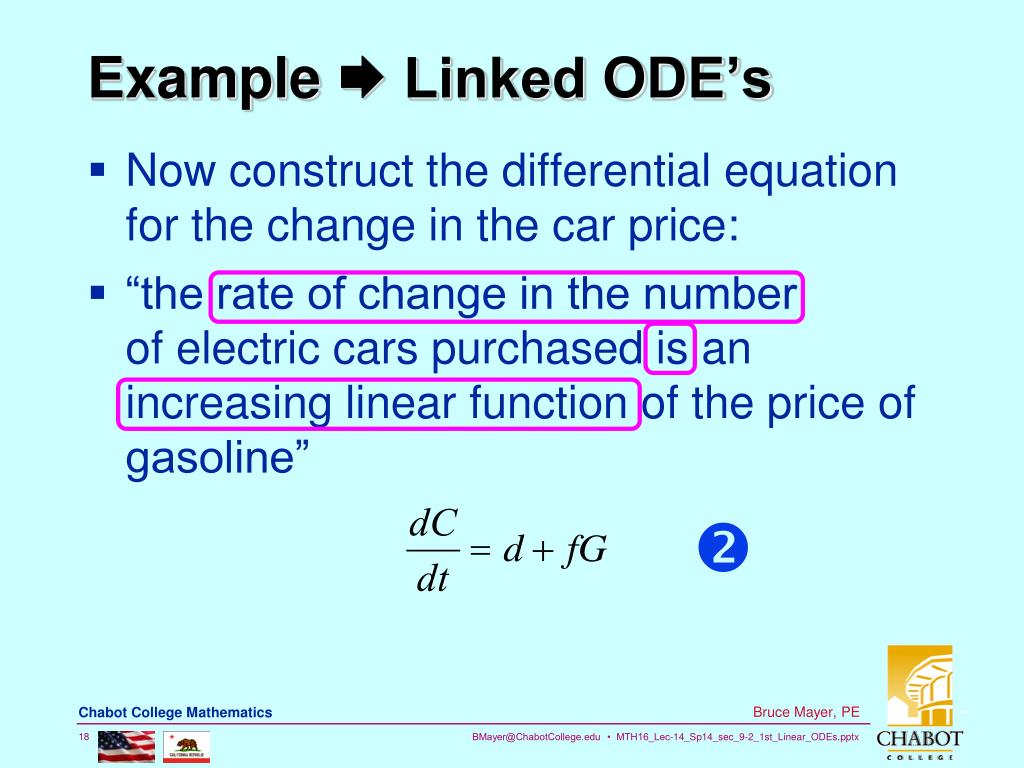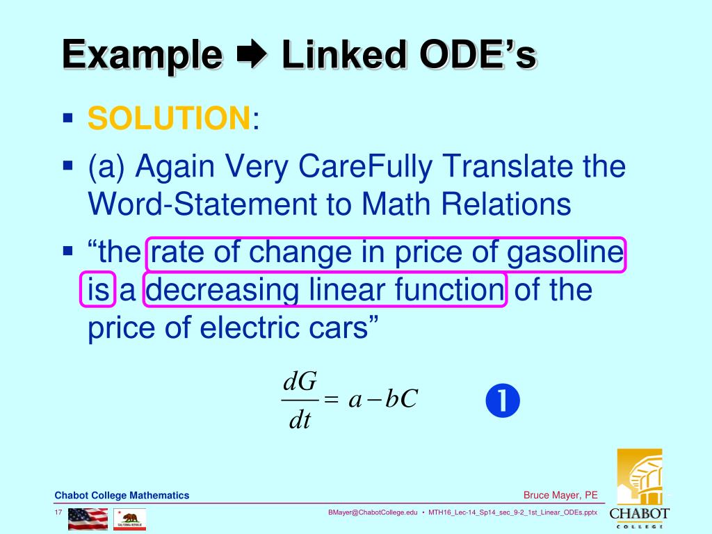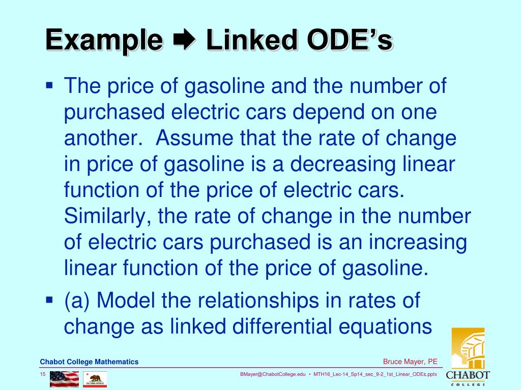 Example Linked ODE’s • SOLUTION: • (a) Again Very CareFully Translate the Word-Statement to Math Relations • “the rate of change in price of gasoline is a decreasing linear function of the price of electric cars”