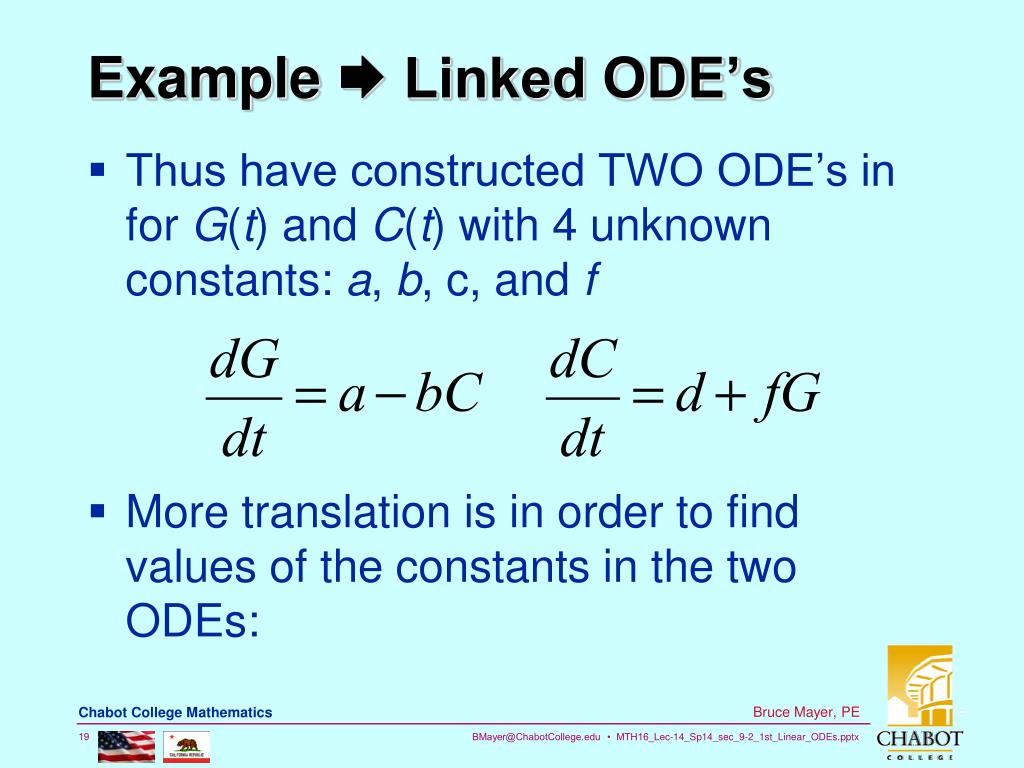 Example Linked ODE’s • Thus have constructed TWO ODE’s in for G(t) and C(t) with 4 unknown constants: a, b, c, and f • More translation is in order to find values of the constants in the two ODEs: