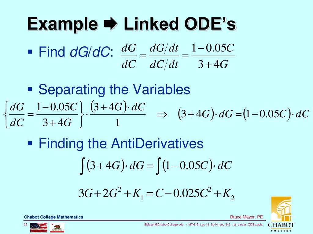 Example Linked ODE’s • Find dG/dC: • Separating the Variables • Finding the AntiDerivatives