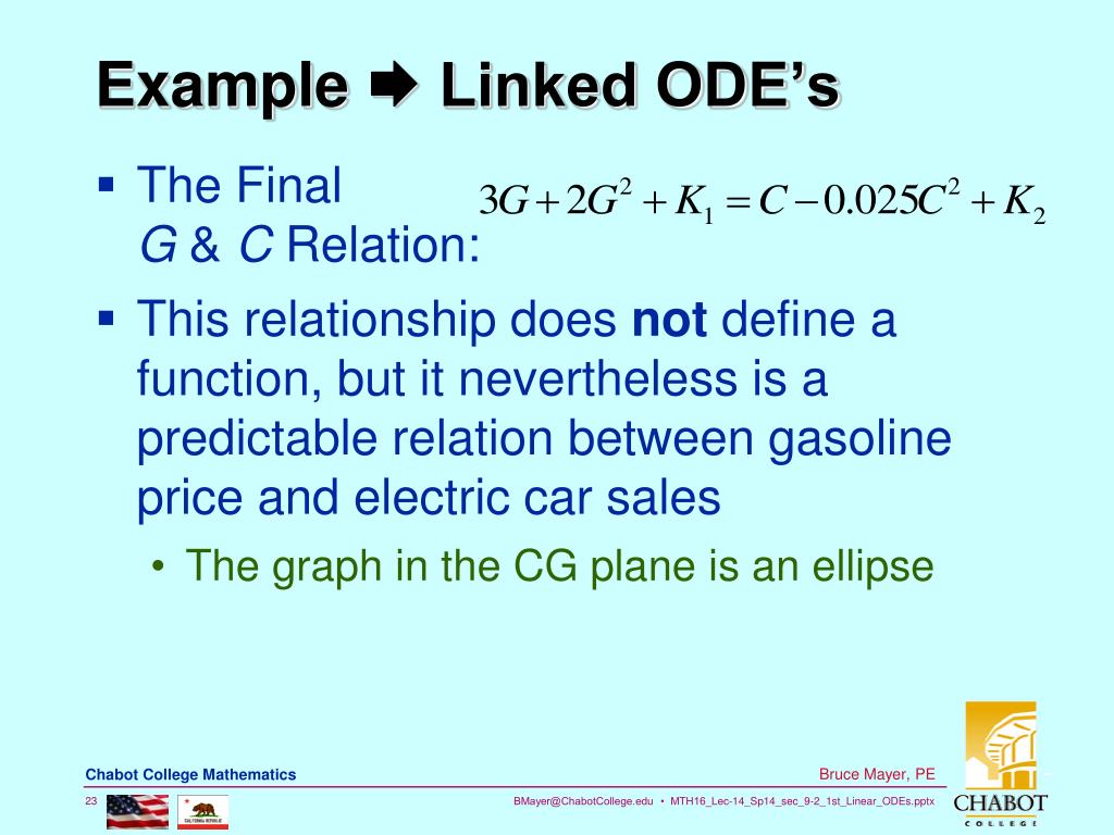 Example Linked ODE’s • The FinalG & C Relation: • This relationship does not define a function, but it nevertheless is a predictable relation between gasoline price and electric car sales • The graph in the CG plane is an ellipse