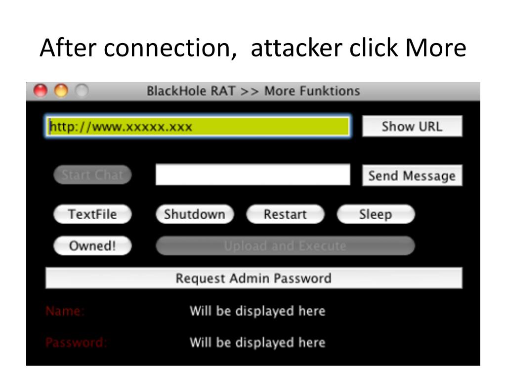 Method • Sophos calls it OSX/MusMinim-A, or 'MusMinim‘ • Its functions include: • Placing text files on the desktop • Sending a restart, shutdown or sleep command • Running arbitrary shell commands • Placing a full screen window with a message that only allows you to click reboot • Sending URLs to the client to open a website • Popping up a fake "Administrator Password" window to phish the target