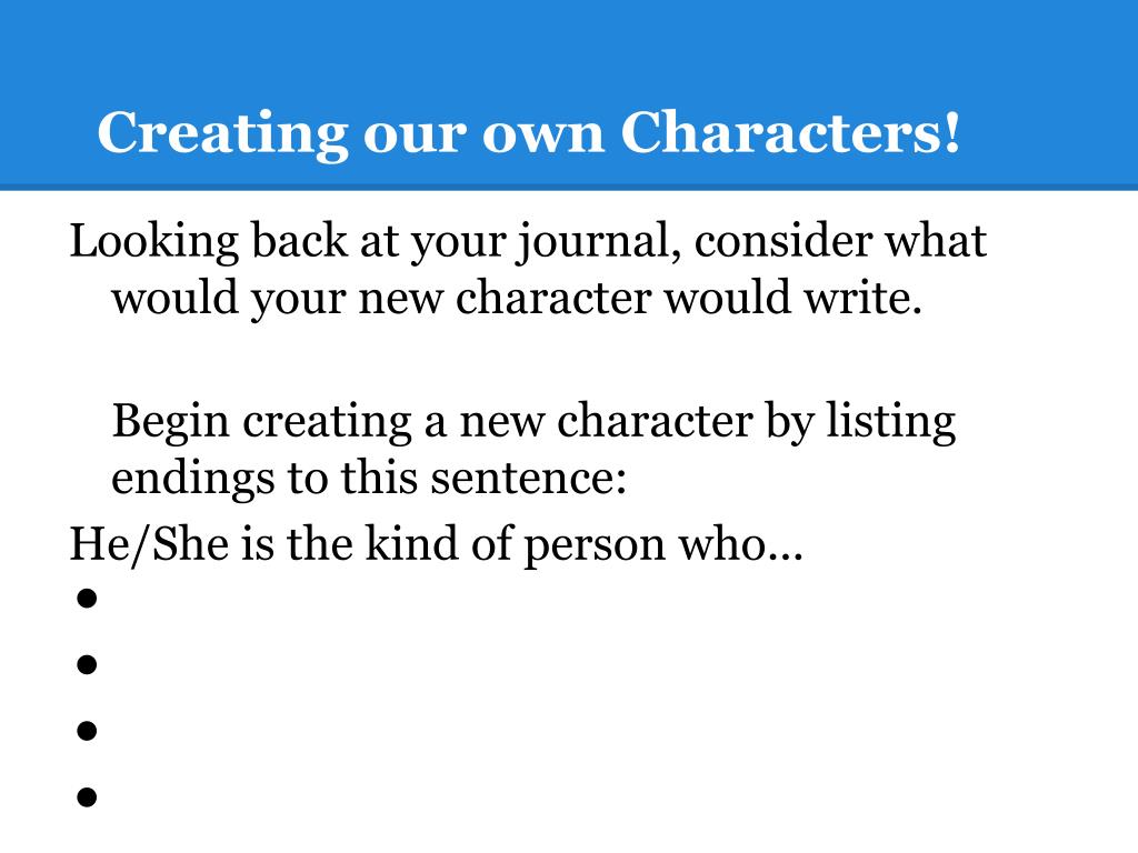 Creating our own Characters! Looking back at your journal, consider what would your new character would write. Begin creating a new character by listing endings to this sentence: He/She is the kind of person who...