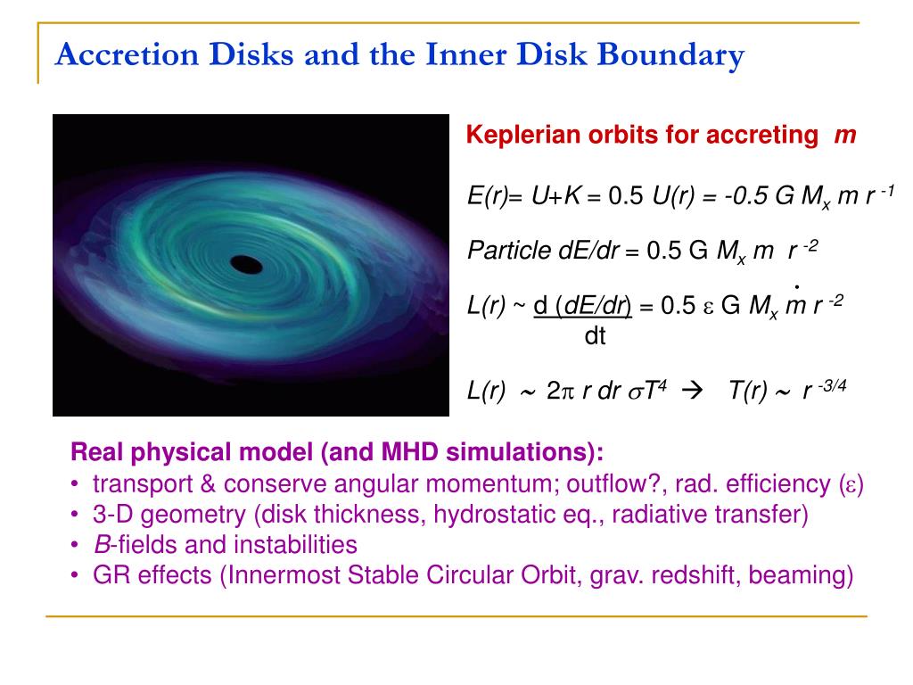 Accretion Disks and the Inner Disk Boundary Keplerian orbits for accreting m E(r)= U+K = 0.5 U(r) = -0.5 G Mx m r -1 Particle dE/dr = 0.5 G Mx mr -2 = L(r) ~ d (dE/dr) = 0.5 e G Mx mr -2 dt L(r) ~2pr dr sT4 T(r) ~ r -3/4 • Real physical model (and MHD simulations): • transport & conserve angular momentum; outflow?, rad. efficiency (e) • 3-D geometry (disk thickness, hydrostatic eq., radiative transfer) • B-fields and instabilities • GR effects (Innermost Stable Circular Orbit, grav. redshift, beaming)