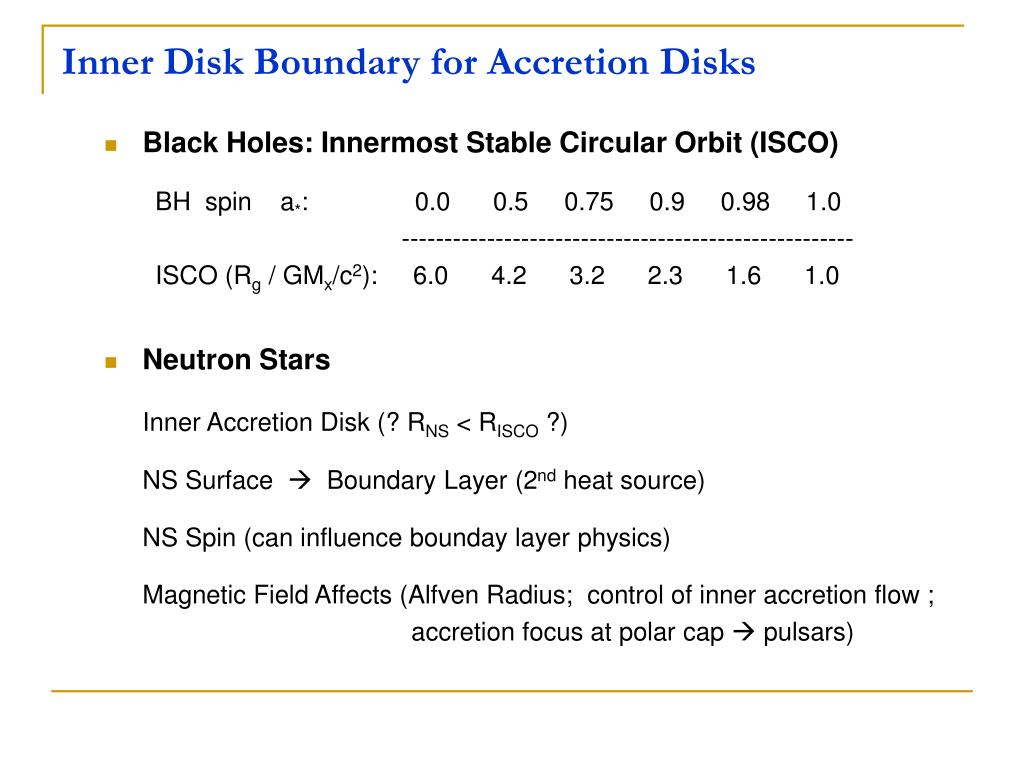Inner Disk Boundary for Accretion Disks • Black Holes: Innermost Stable Circular Orbit (ISCO) BH spin a*: 0.0 0.5 0.75 0.9 0.98 1.0 ----------------------------------------------------- ISCO (Rg / GMx/c2): 6.0 4.2 3.2 2.3 1.6 1.0 • Neutron Stars Inner Accretion Disk (? RNS < RISCO ?) NS Surface Boundary Layer (2nd heat source) NS Spin (can influence bounday layer physics) Magnetic Field Affects (Alfven Radius; control of inner accretion flow ; accretion focus at polar cap pulsars)