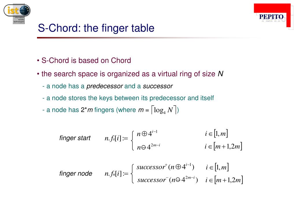 PEPITO S-Chord: the finger table • S-Chord is based on Chord • the search space is organized as a virtual ring of size N • - a node has a predecessor and a successor • - a node stores the keys between its predecessor and itself • - a node has 2*mfingers(wherem = ) • finger start • finger node