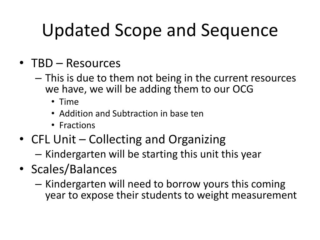 Updated Scope and Sequence • TBD – Resources • This is due to them not being in the current resources we have, we will be adding them to our OCG • Time • Addition and Subtraction in base ten • Fractions • CFL Unit – Collecting and Organizing • Kindergarten will be starting this unit this year • Scales/Balances • Kindergarten will need to borrow yours this coming year to expose their students to weight measurement