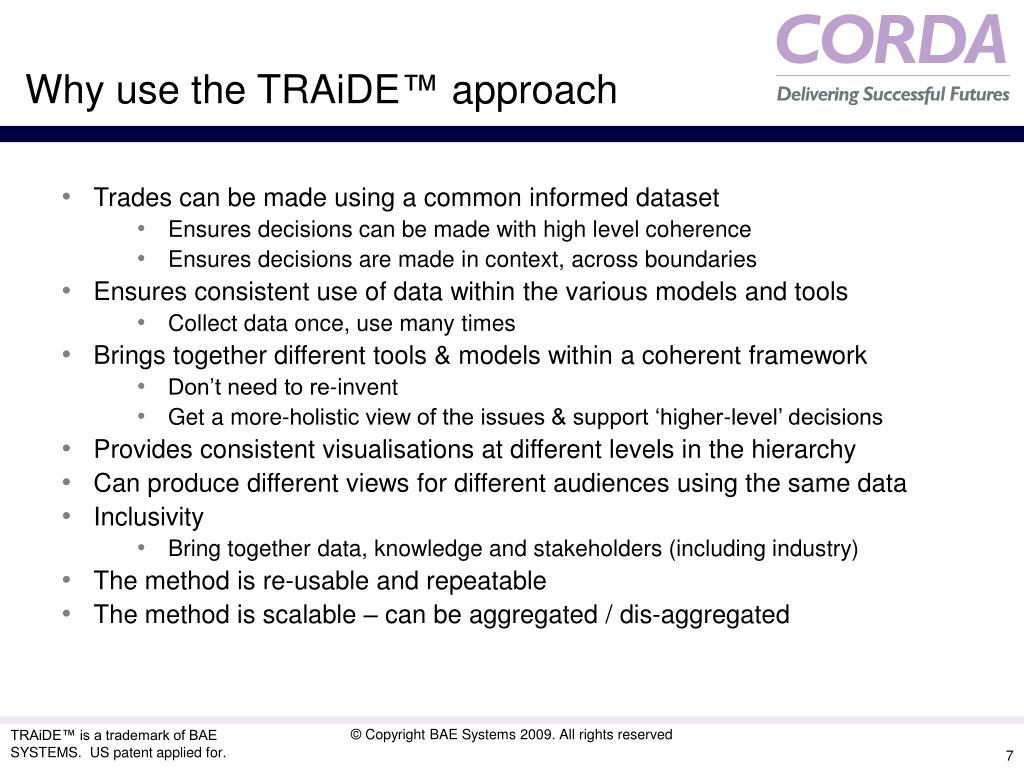 TRAiDE™ is a framework, not a tool Combines people, processes, techniques and information management TRAiDE™ is inclusive Allows existing tools, models and data to be integrated It can support trade-offs and capability management at different levels involving different stakeholders It offers a way of improving our use of OA by bringing together discrete studies & toolsets in a coherent way TRAiDE™ has been used successfully by BAE Systems on a number of studies / engagements In support of MOD In support of BAE Systems To support joint MOD & BAE Systems studies Summary