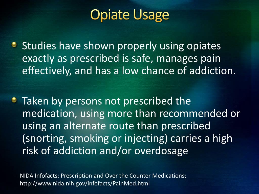 Opiate Usage • Studies have shown properly using opiates exactly as prescribed is safe, manages pain effectively, and has a low chance of addiction. • Taken by persons not prescribed the medication, using more than recommended or using an alternate route than prescribed (snorting, smoking or injecting) carries a high risk of addiction and/or overdosage NIDA Infofacts: Prescription and Over the Counter Medications; http://www.nida.nih.gov/infofacts/PainMed.html