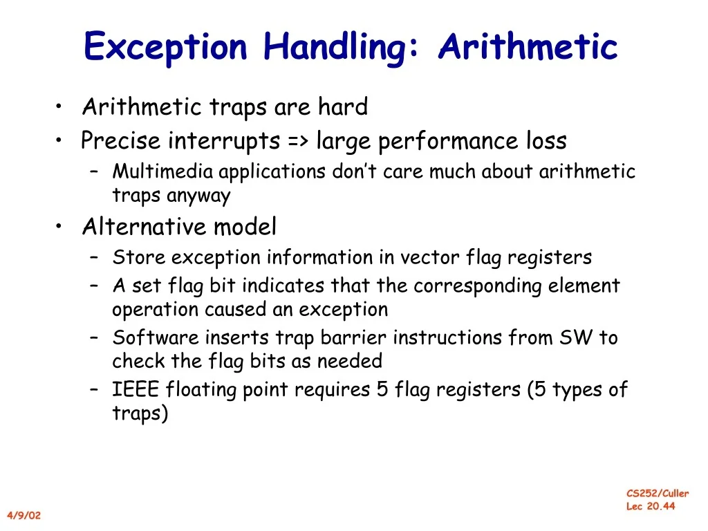 Exception Handling: Arithmetic • Arithmetic traps are hard • Precise interrupts => large performance loss • Multimedia applications don’t care much about arithmetic traps anyway • Alternative model • Store exception information in vector flag registers • A set flag bit indicates that the corresponding element operation caused an exception • Software inserts trap barrier instructions from SW to check the flag bits as needed • IEEE floating point requires 5 flag registers (5 types of traps)