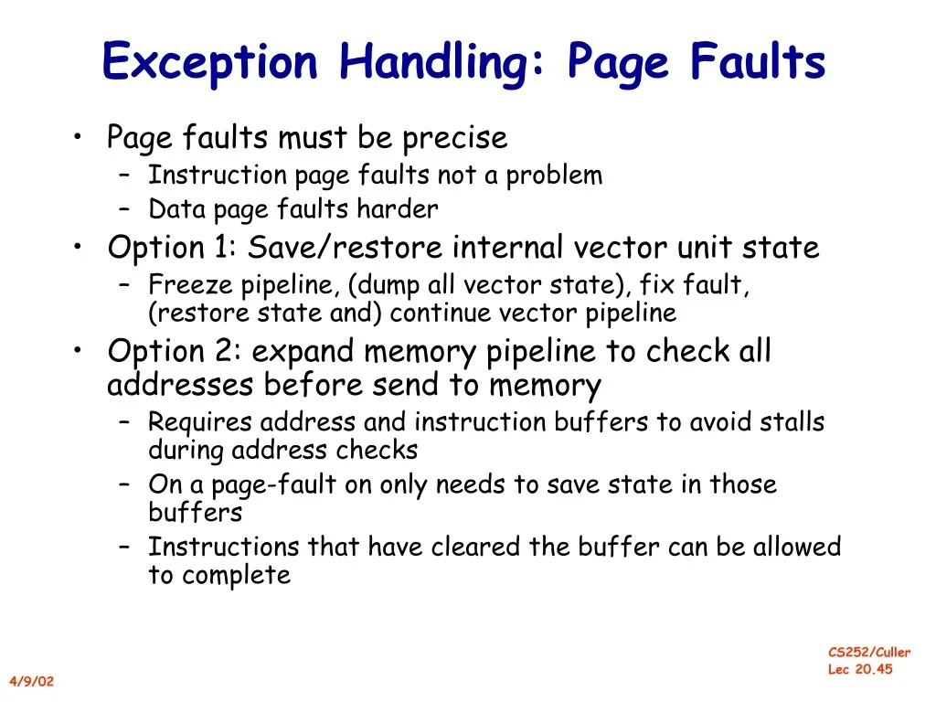 Exception Handling: Page Faults • Page faults must be precise • Instruction page faults not a problem • Data page faults harder • Option 1: Save/restore internal vector unit state • Freeze pipeline, (dump all vector state), fix fault, (restore state and) continue vector pipeline • Option 2: expand memory pipeline to check all addresses before send to memory • Requires address and instruction buffers to avoid stalls during address checks • On a page-fault on only needs to save state in those buffers • Instructions that have cleared the buffer can be allowed to complete
