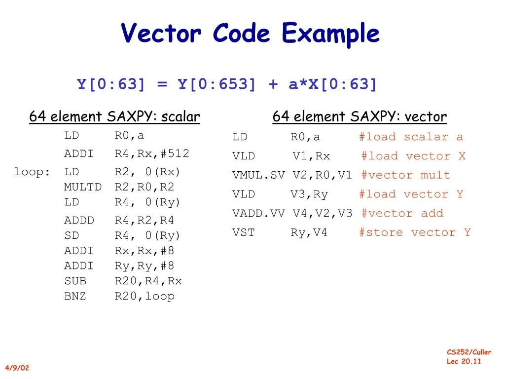 64 element SAXPY: scalar LD R0,a ADDI R4,Rx,#512 loop: LD R2, 0(Rx) MULTD R2,R0,R2 LD R4, 0(Ry) ADDD R4,R2,R4 SD R4, 0(Ry) ADDI Rx,Rx,#8 ADDI Ry,Ry,#8 SUB R20,R4,Rx BNZ R20,loop 64 element SAXPY: vector LD R0,a #load scalar a VLD V1,Rx #load vector X VMUL.SV V2,R0,V1 #vector mult VLD V3,Ry #load vector Y VADD.VV V4,V2,V3 #vector add VST Ry,V4 #store vector Y Vector Code Example Y[0:63] = Y[0:653] + a*X[0:63]
