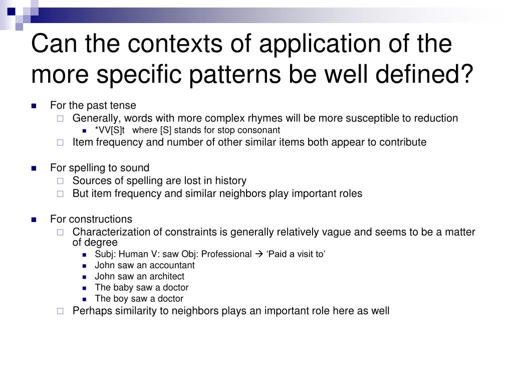 Can the contexts of application of the more specific patterns be well defined? • For the past tense • Generally, words with more complex rhymes will be more susceptible to reduction • *VV[S]t where [S] stands for stop consonant • Item frequency and number of other similar items both appear to contribute • For spelling to sound • Sources of spelling are lost in history • But item frequency and similar neighbors play important roles • For constructions • Characterization of constraints is generally relatively vague and seems to be a matter of degree • Subj: Human V: saw Obj: Professional ‘Paid a visit to’ • John saw an accountant • John saw an architect • The baby saw a doctor • The boy saw a doctor • Perhaps similarity to neighbors plays an important role here as well