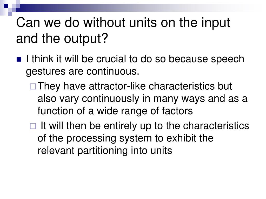 Can we do without units on the input and the output? • I think it will be crucial to do so because speech gestures are continuous. • They have attractor-like characteristics but also vary continuously in many ways and as a function of a wide range of factors • It will then be entirely up to the characteristics of the processing system to exhibit the relevant partitioning into units