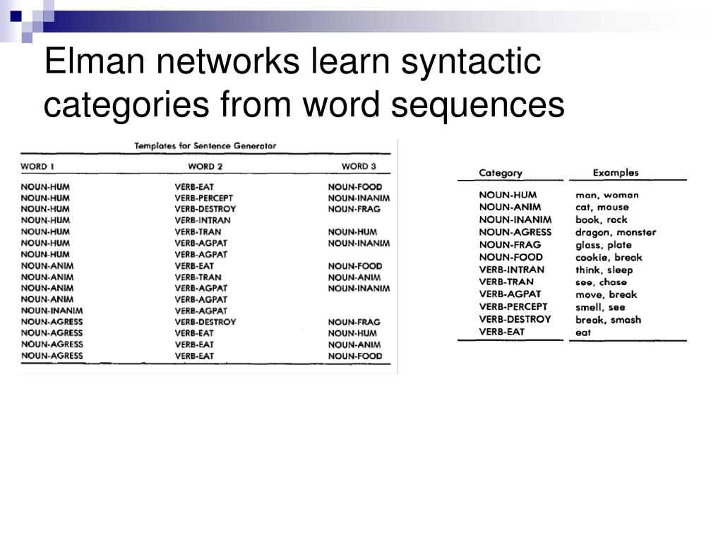 Elman’s Simple Recurrent Network • Finds larger units with coherent internal structure from time series of inputs. • Series are usually discretized at conventional linguistic unit boundaries, but this is just for simplicity. • Uses hidden unit state from processing of previous input as context for next input.