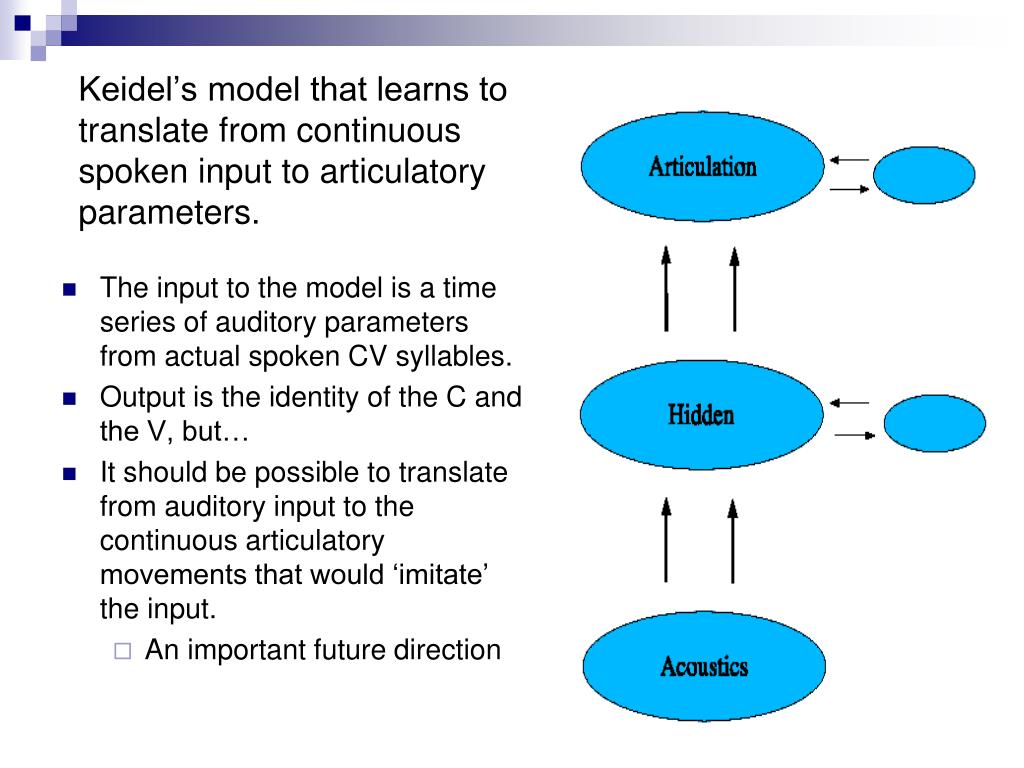 Keidel’s model that learns to translate from continuous spoken input to articulatory parameters. • The input to the model is a time series of auditory parameters from actual spoken CV syllables. • Output is the identity of the C and the V, but… • It should be possible to translate from auditory input to the continuous articulatory movements that would ‘imitate’ the input. • An important future direction