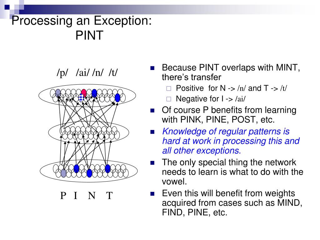 Processing an Exception: PINT • Because PINT overlaps with MINT, there’s transfer • Positive for N -> /n/ and T -> /t/ • Negative for I -> /ai/ • Of course P benefits from learning with PINK, PINE, POST, etc. • Knowledge of regular patterns is hard at work in processing this and all other exceptions. • The only special thing the network needs to learn is what to do with the vowel. • Even this will benefit from weights acquired from cases such as MIND, FIND, PINE, etc. /p/ /ai/ /n/ /t/ P I N T