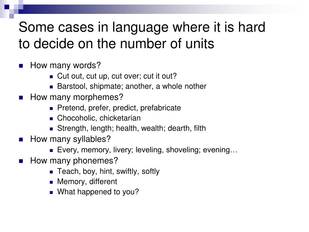 Some cases in language where it is hard to decide on the number of units • How many words? • Cut out, cut up, cut over; cut it out? • Barstool, shipmate; another, a whole nother • How many morphemes? • Pretend, prefer, predict, prefabricate • Chocoholic, chicketarian • Strength, length; health, wealth; dearth, filth • How many syllables? • Every, memory, livery; leveling, shoveling; evening… • How many phonemes? • Teach, boy, hint, swiftly, softly • Memory, different • What happened to you?