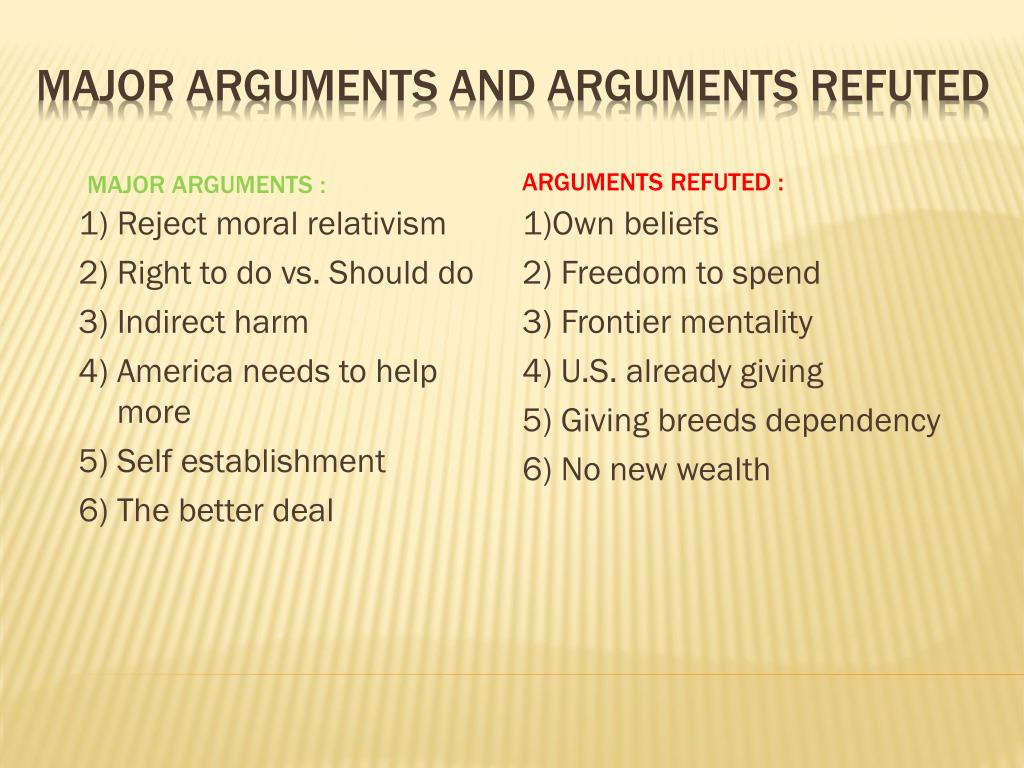 Major Arguments : Arguments Refuted : 1) Reject moral relativism 2) Right to do vs. Should do 3) Indirect harm 4) America needs to help more 5) Self establishment 6) The better deal 1)Own beliefs 2) Freedom to spend 3) Frontier mentality 4) U.S. already giving 5) Giving breeds dependency 6) No new wealth Major Arguments and Arguments Refuted