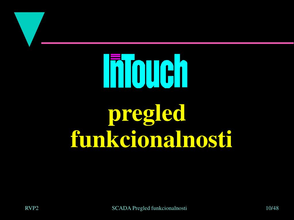 Pregled vsebine • Osnovne naloge SCADA/HMI sistemov • Priporočila za izbiro • Pregled SCADA sistemov • InTouch - pregled funkcionalnosti SCADA Pregled funkcionalnosti