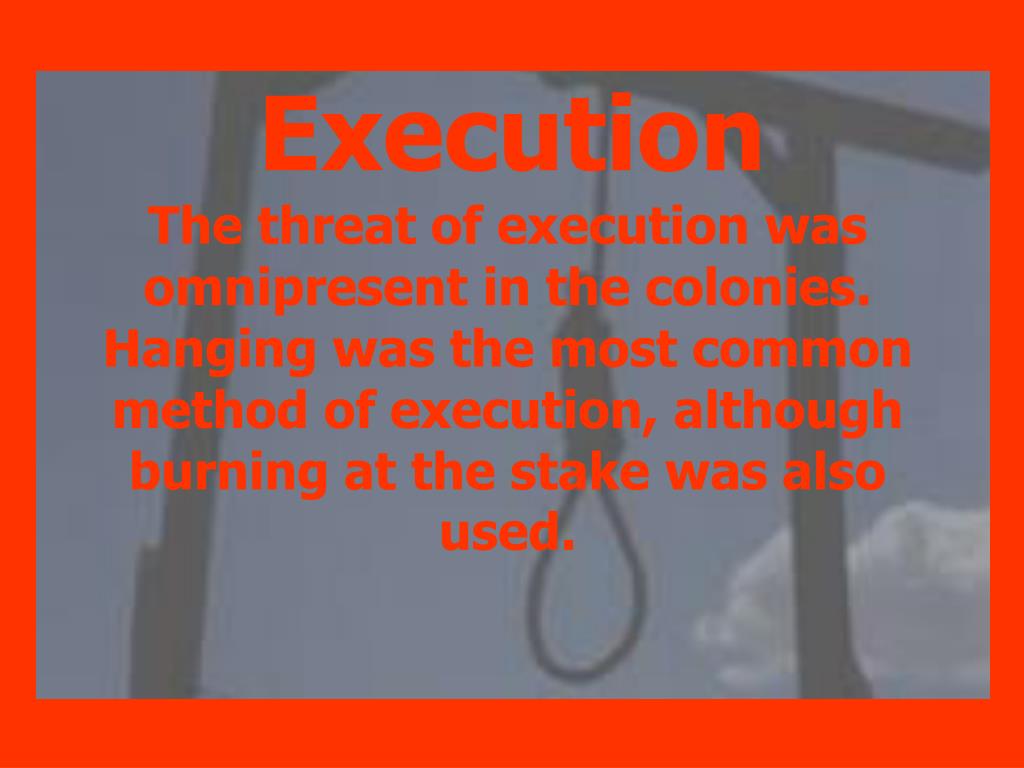 Execution The threat of execution was omnipresent in the colonies. Hanging was the most common method of execution, although burning at the stake was also used.