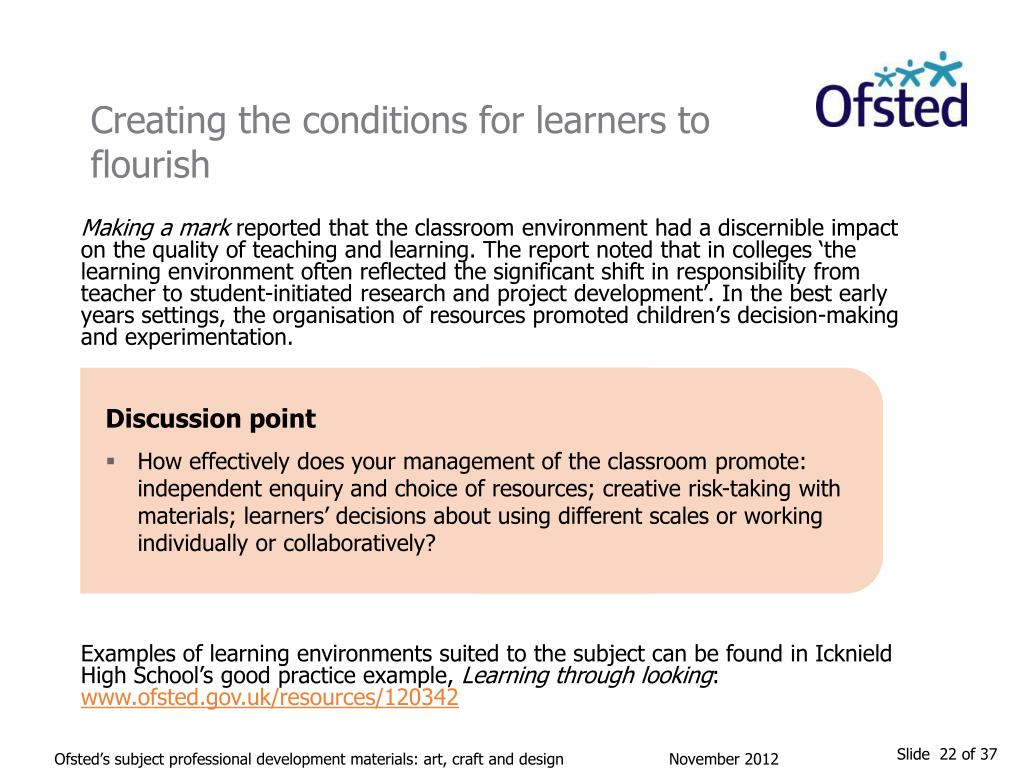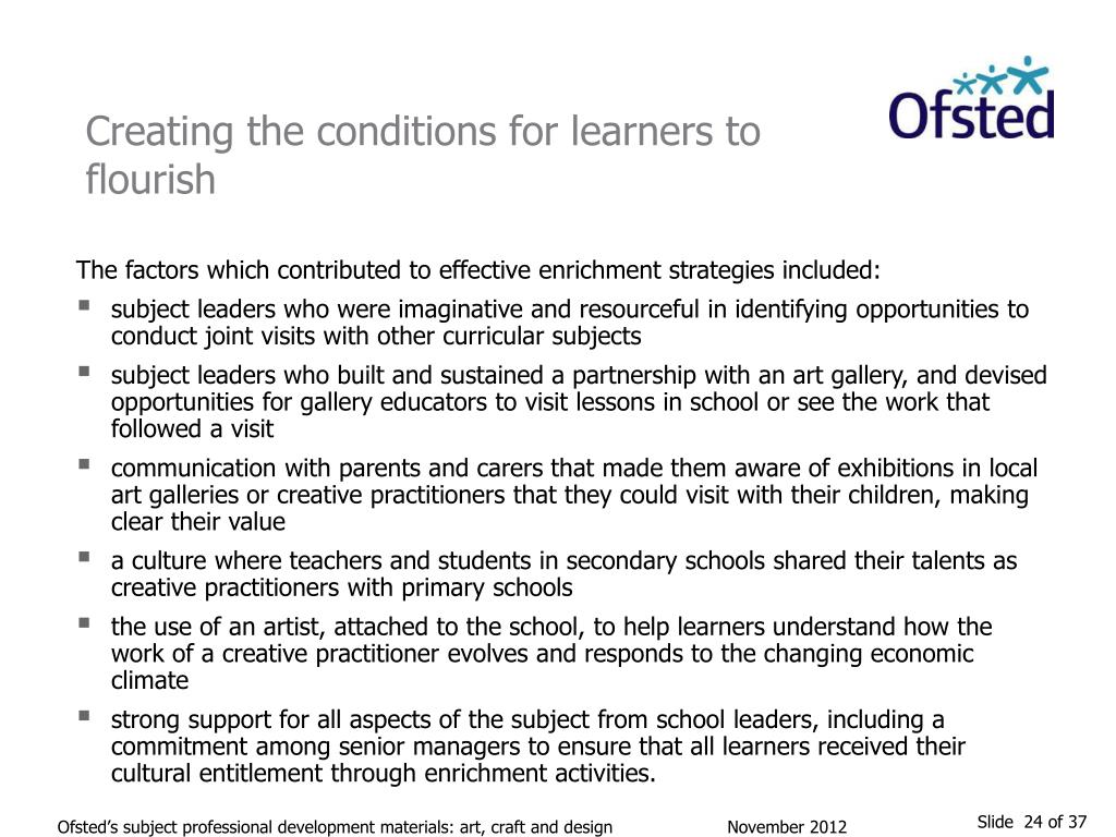 Creating the conditions for learners to flourish The factors which contributed to effective enrichment strategies included: subject leaders who were imaginative and resourceful in identifying opportunities to conduct joint visits with other curricular subjects subject leaders who built and sustained a partnership with an art gallery, and devised opportunities for gallery educators to visit lessons in school or see the work that followed a visit communication with parents and carers that made them aware of exhibitions in local art galleries or creative practitioners that they could visit with their children, making clear their value a culture where teachers and students in secondary schools shared their talents as creative practitioners with primary schools the use of an artist, attached to the school, to help learners understand how the work of a creative practitioner evolves and responds to the changing economic climate strong support for all aspects of the subject from school leaders, including a commitment among senior managers to ensure that all learners received their cultural entitlement through enrichment activities. Ofsted’s subject professional development materials: art, craft and design November 2012