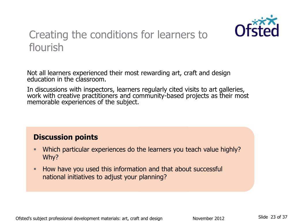 Creating the conditions for learners to flourish Not all learners experienced their most rewarding art, craft and design education in the classroom. In discussions with inspectors, learners regularly cited visits to art galleries, work with creative practitioners and community-based projects as their most memorable experiences of the subject. Discussion points • Which particular experiences do the learners you teach value highly? Why? • How have you used this information and that about successful national initiatives to adjust your planning? Ofsted’s subject professional development materials: art, craft and design November 2012