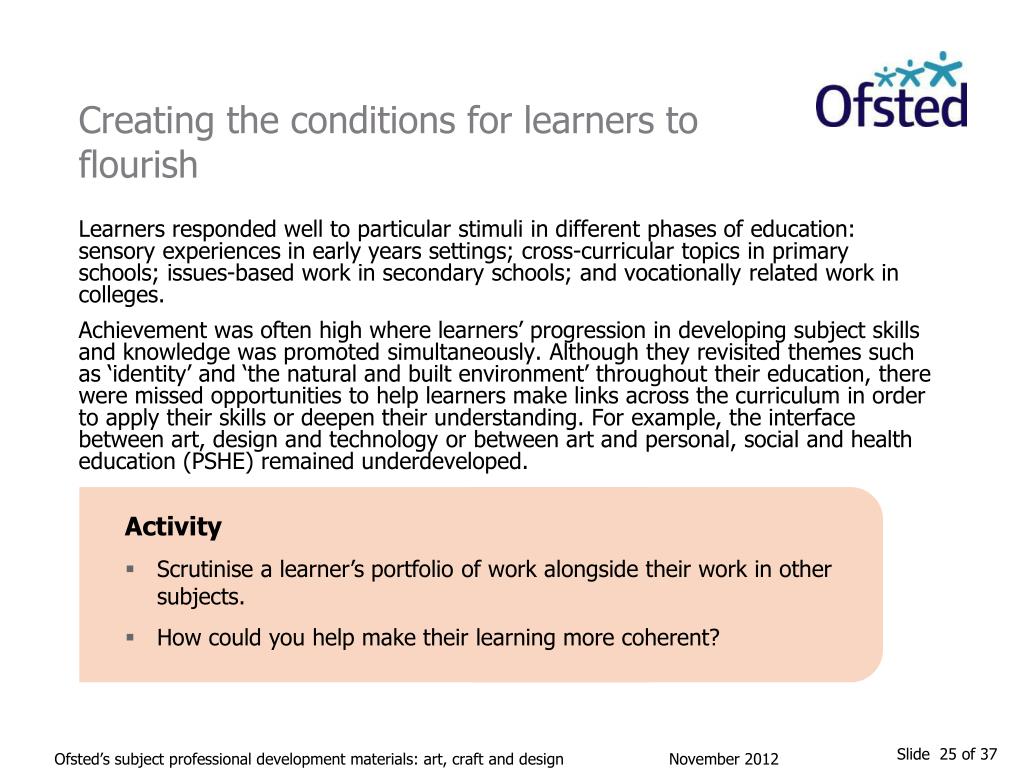 Creating the conditions for learners to flourish Learners responded well to particular stimuli in different phases of education: sensory experiences in early years settings; cross-curricular topics in primary schools; issues-based work in secondary schools; and vocationally related work in colleges. Achievement was often high where learners’ progression in developing subject skills and knowledge was promoted simultaneously. Although they revisited themes such as ‘identity’ and ‘the natural and built environment’ throughout their education, there were missed opportunities to help learners make links across the curriculum in order to apply their skills or deepen their understanding. For example, the interface between art, design and technology or between art and personal, social and health education (PSHE) remained underdeveloped. Activity • Scrutinise a learner’s portfolio of work alongside their work in other subjects. • How could you help make their learning more coherent? Ofsted’s subject professional development materials: art, craft and design November 2012