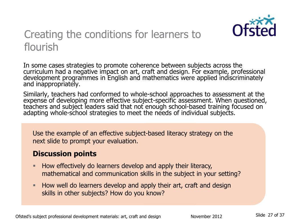 Creating the conditions for learners to flourish In some cases strategies to promote coherence between subjects across the curriculum had a negative impact on art, craft and design. For example, professional development programmes in English and mathematics were applied indiscriminately and inappropriately. Similarly, teachers had conformed to whole-school approaches to assessment at the expense of developing more effective subject-specific assessment. When questioned, teachers and subject leaders said that not enough school-based training focused on adapting whole-school strategies to meet the needs of individual subjects. Use the example of an effective subject-based literacy strategy on the next slide to prompt your evaluation. Discussion points • How effectively do learners develop and apply their literacy, mathematical and communication skills in the subject in your setting? • How well do learners develop and apply their art, craft and design skills in other subjects? How do you know? Ofsted’s subject professional development materials: art, craft and design November 2012