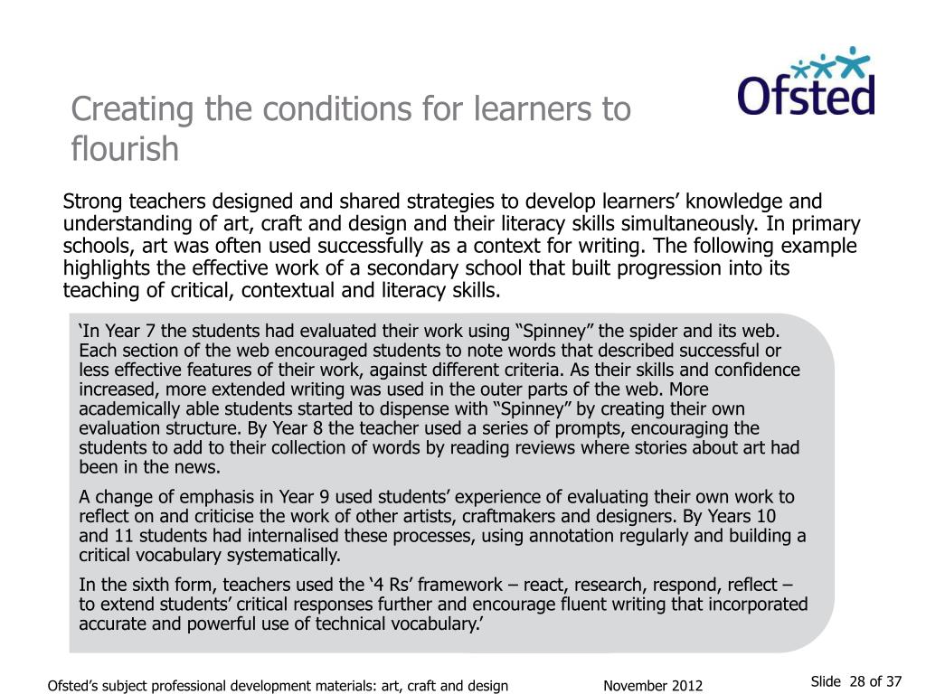 Creating the conditions for learners to flourish Strong teachers designed and shared strategies to develop learners’ knowledge and understanding of art, craft and design and their literacy skills simultaneously. In primary schools, art was often used successfully as a context for writing. The following example highlights the effective work of a secondary school that built progression into its teaching of critical, contextual and literacy skills. ‘In Year 7 the students had evaluated their work using “Spinney” the spider and its web. Each section of the web encouraged students to note words that described successful or less effective features of their work, against different criteria. As their skills and confidence increased, more extended writing was used in the outer parts of the web. More academically able students started to dispense with “Spinney” by creating their own evaluation structure. By Year 8 the teacher used a series of prompts, encouraging the students to add to their collection of words by reading reviews where stories about art had been in the news. A change of emphasis in Year 9 used students’ experience of evaluating their own work to reflect on and criticise the work of other artists, craftmakers and designers. By Years 10 and 11 students had internalised these processes, using annotation regularly and building a critical vocabulary systematically. In the sixth form, teachers used the ‘4 Rs’ framework – react, research, respond, reflect – to extend students’ critical responses further and encourage fluent writing that incorporated accurate and powerful use of technical vocabulary.’ Ofsted’s subject professional development materials: art, craft and design November 2012