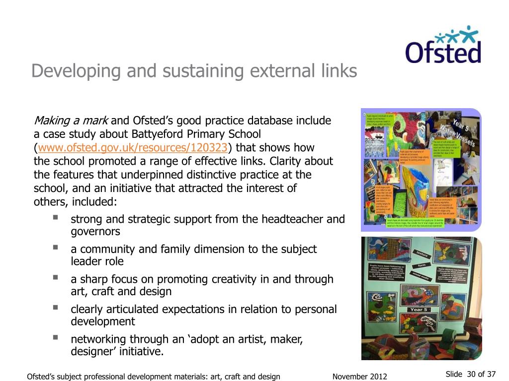 Developing and sustaining external links Making a mark and Ofsted’s good practice database include a case study about Battyeford Primary School (www.ofsted.gov.uk/resources/120323) that shows how the school promoted a range of effective links. Clarity about the features that underpinned distinctive practice at the school, and an initiative that attracted the interest of others, included: • strong and strategic support from the headteacher and governors • a community and family dimension to the subject leader role • a sharp focus on promoting creativity in and through art, craft and design • clearly articulated expectations in relation to personal development • networking through an ‘adopt an artist, maker, designer’ initiative. Ofsted’s subject professional development materials: art, craft and design November 2012