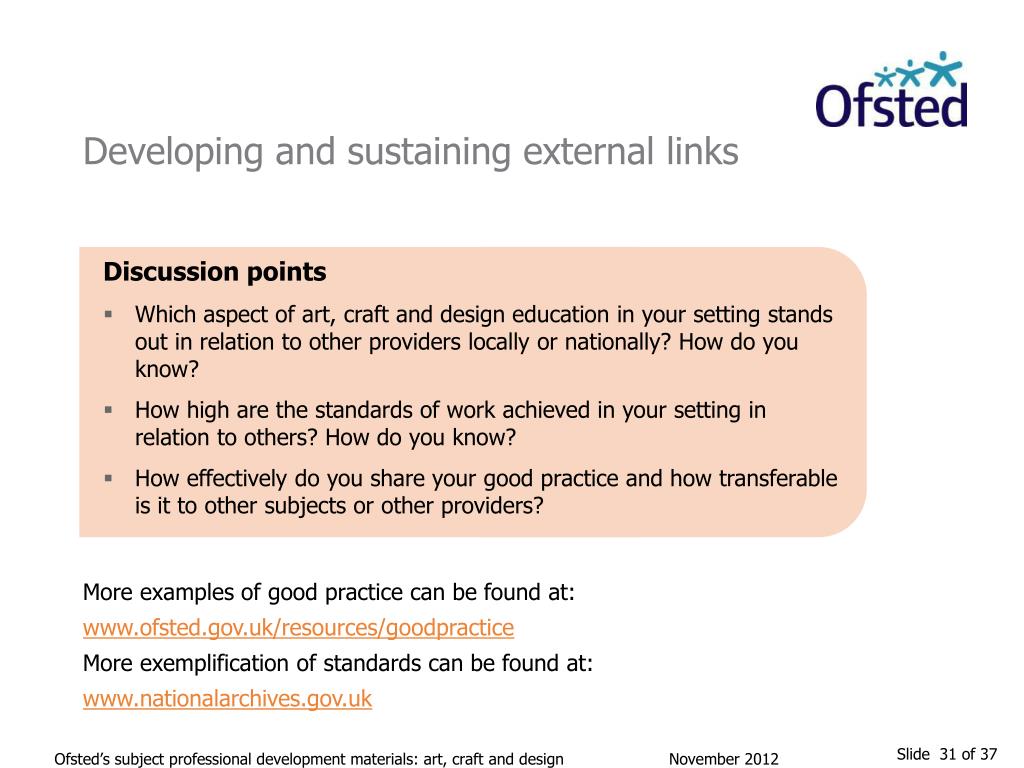 Developing and sustaining external links Discussion points • Which aspect of art, craft and design education in your setting stands out in relation to other providers locally or nationally? How do you know? • How high are the standards of work achieved in your setting in relation to others? How do you know? • How effectively do you share your good practice and how transferable is it to other subjects or other providers? More examples of good practice can be found at: www.ofsted.gov.uk/resources/goodpractice More exemplification of standards can be found at: www.nationalarchives.gov.uk Ofsted’s subject professional development materials: art, craft and design November 2012