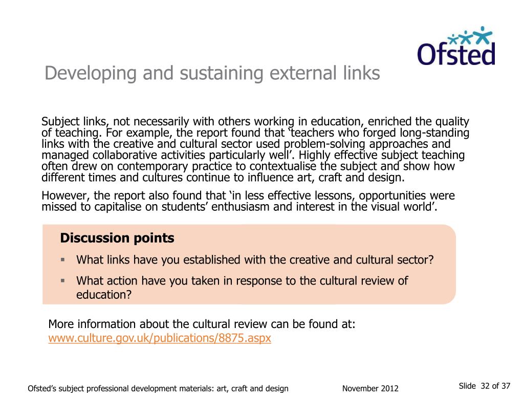 Developing and sustaining external links Subject links, not necessarily with others working in education, enriched the quality of teaching. For example, the report found that ‘teachers who forged long-standing links with the creative and cultural sector used problem-solving approaches and managed collaborative activities particularly well’. Highly effective subject teaching often drew on contemporary practice to contextualise the subject and show how different times and cultures continue to influence art, craft and design. However, the report also found that ‘in less effective lessons, opportunities were missed to capitalise on students’ enthusiasm and interest in the visual world’. Discussion points • What links have you established with the creative and cultural sector? • What action have you taken in response to the cultural review of education? More information about the cultural review can be found at: www.culture.gov.uk/publications/8875.aspx Ofsted’s subject professional development materials: art, craft and design November 2012