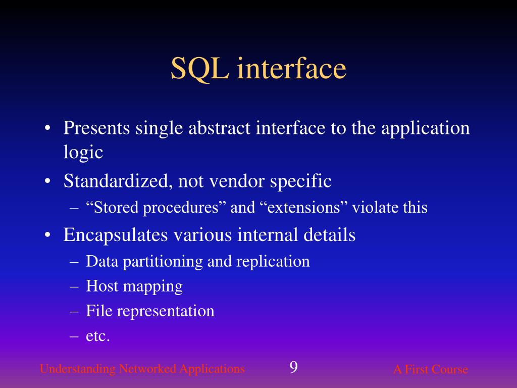 SQL interface • Presents single abstract interface to the application logic • Standardized, not vendor specific • “Stored procedures” and “extensions” violate this • Encapsulates various internal details • Data partitioning and replication • Host mapping • File representation • etc.