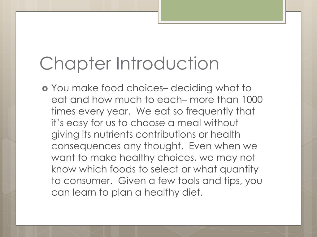 Chapter Introduction • You make food choices– deciding what to eat and how much to each– more than 1000 times every year. We eat so frequently that it’s easy for us to choose a meal without giving its nutrients contributions or health consequences any thought. Even when we want to make healthy choices, we may not know which foods to select or what quantity to consumer. Given a few tools and tips, you can learn to plan a healthy diet.