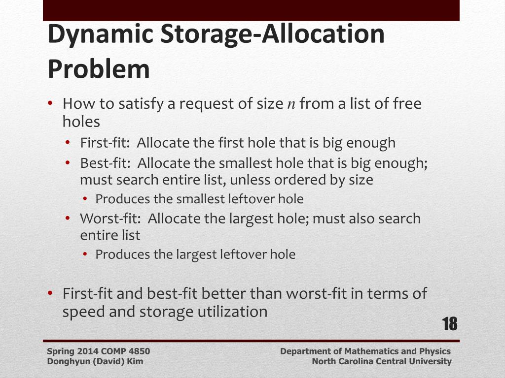 How to satisfy a request of size n from a list of free holes • First-fit: Allocate the first hole that is big enough • Best-fit: Allocate the smallest hole that is big enough; must search entire list, unless ordered by size • Produces the smallest leftover hole • Worst-fit: Allocate the largest hole; must also search entire list • Produces the largest leftover hole • First-fit and best-fit better than worst-fit in terms of speed and storage utilization Dynamic Storage-Allocation Problem