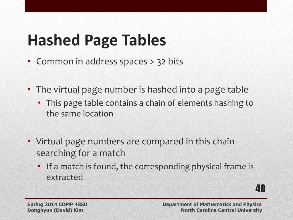 Common in address spaces > 32 bits • The virtual page number is hashed into a page table • This page table contains a chain of elements hashing to the same location • Virtual page numbers are compared in this chain searching for a match • If a match is found, the corresponding physical frame is extracted Hashed Page Tables