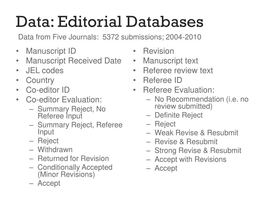 Data: Editorial Databases Data from Five Journals: 5372 submissions; 2004-2010 • Manuscript ID • Manuscript Received Date • JEL codes • Country • Co-editor ID • Co-editor Evaluation: • Summary Reject, No Referee Input • Summary Reject, Referee Input • Reject • Withdrawn • Returned for Revision • Conditionally Accepted (Minor Revisions) • Accept • Revision • Manuscript text • Referee review text • Referee ID • Referee Evaluation: • No Recommendation (i.e. no review submitted) • Definite Reject • Reject • Weak Revise & Resubmit • Revise & Resubmit • Strong Revise & Resubmit • Accept with Revisions • Accept